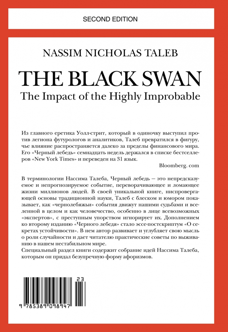 За одно только последнее десятилетие человечество пережило ряд тяжелейших катастроф, потрясений и катаклизмов, не укладывающихся в рамки самых фантастических предсказаний. Пятидесятидвухлетний ливанец, выпускник Сорбонны и нью-йоркский финансовый гуру Нассим Талеб называет такие непрогнозируемые события Черными лебедями. Он убежден: именно они дают толчок как истории в целом, так и существованию каждого отдельного человека. И чтобы преуспеть, надо быть к ним готовыми. Сразу после выхода "Черного лебедя" автор блестяще продемонстрировал свою "не-теорию" на практике: на фоне финансового кризиса компания Талеба заработала (а не потеряла!) для инвесторов полмиллиарда долларов. Но его труд - не учебник по экономике. Это размышления очень незаурядного человека о жизни и о том, как найти в ней свое место. В написанном им позже эссе-постскриптуме "О секретах устойчивости" Талеб дает остроумный отпор тем экономистам-ортодоксам, которые приняли созданное им анти-учение в штыки.
