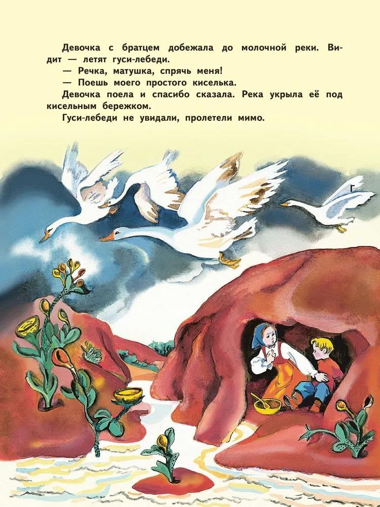Остались братец с сестрицею дома одни, да вот беда: ослушалась девочка родителей, заигралась и не уследила — унесли братца злые Гуси-лебеди в темный лес. Как же теперь отыскать их? Рисунки Нины Носкович проведут маленьких читателей по волшебному миру русской сказки, расцветив яркими акварельными красками ее сюжет — и полные народной мудрости сказочные образы оживут на страницах книги. Пересказ Алексея Толстого.