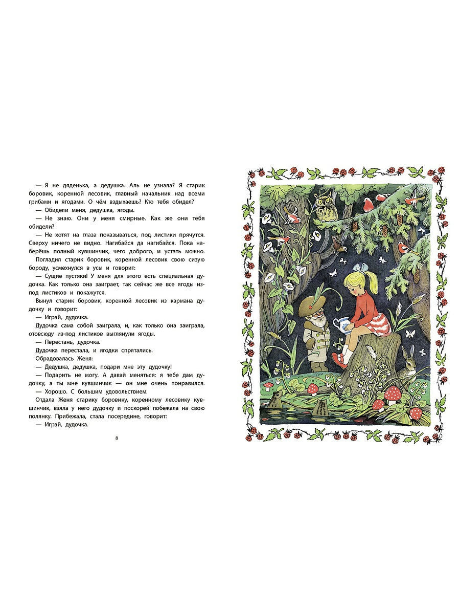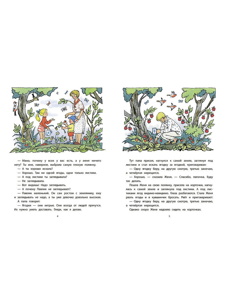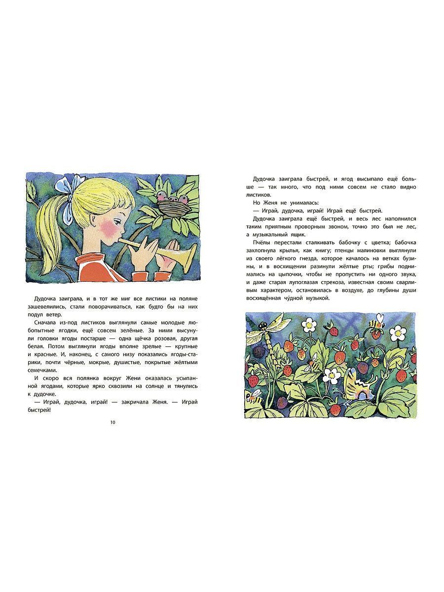 Отправилась девочка Женя собирать землянику. Много в лесу сладкой душистой ягоды, но только найти ее непросто - под каждый листик нужно заглянуть. Так, чего доброго, и устать можно! Вот если бы Жене кто-нибудь помог! Но можно ли, даже с помощью волшебной дудочки, без труда собрать целый кувшинчик земляники? Об этом малышам расскажет поучительная сказка Валентина Катаева, любимая читателями не меньше, чем его же "Цветик-семицветик". Особое обаяние книге придают красочные и запоминающиеся иллюстрации Натальи Барботченко.