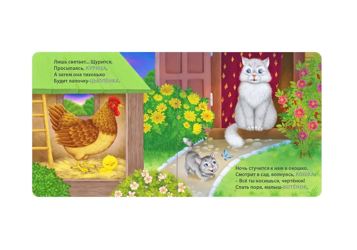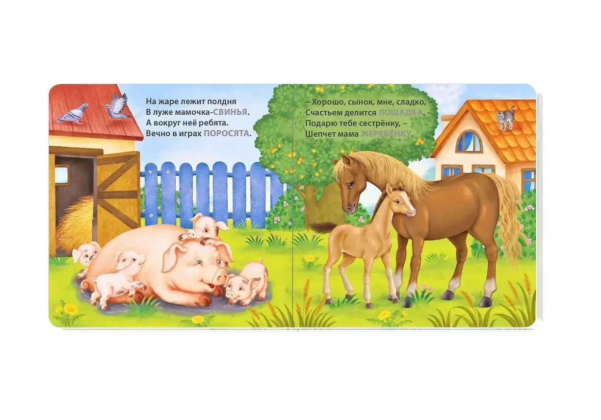 Познавательная книжка — картонка "Мамы и малыши. Домашние животные" в стихах Евгения Сосновского познакомит вашего ребёнка с малышами домашних животных и их мамами. Стихи написаны так, чтобы ребёнок смог сам срифмовать название животного или другие слова. Рассматривайте красочные иллюстрации, читайте стихи, находите рифмы и обсуждайте прочитанное вместе. Чтение стихов и подбор рифмы способствует развитию речи, памяти, воображения и мышления вашего малыша, а также развивают чувство языка.