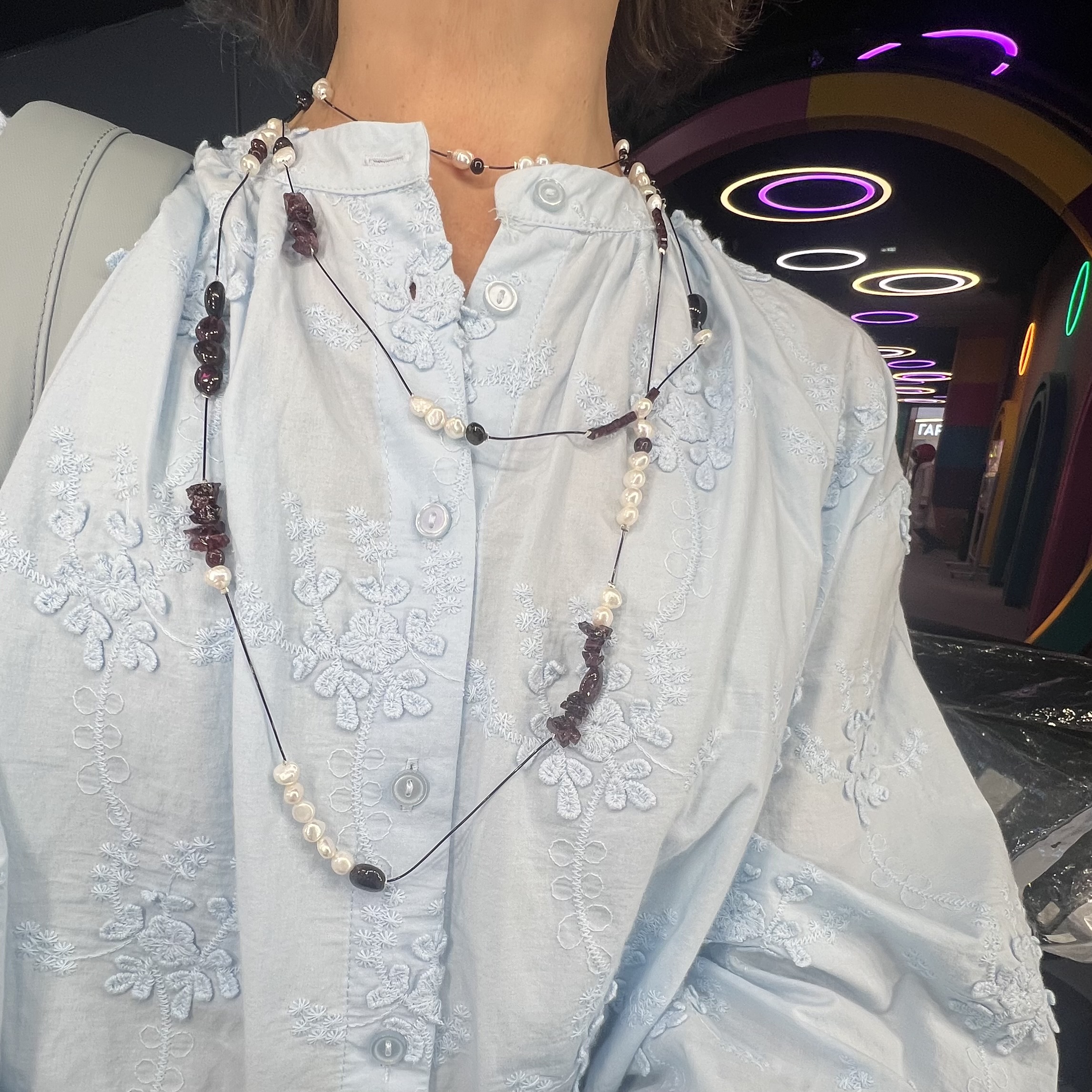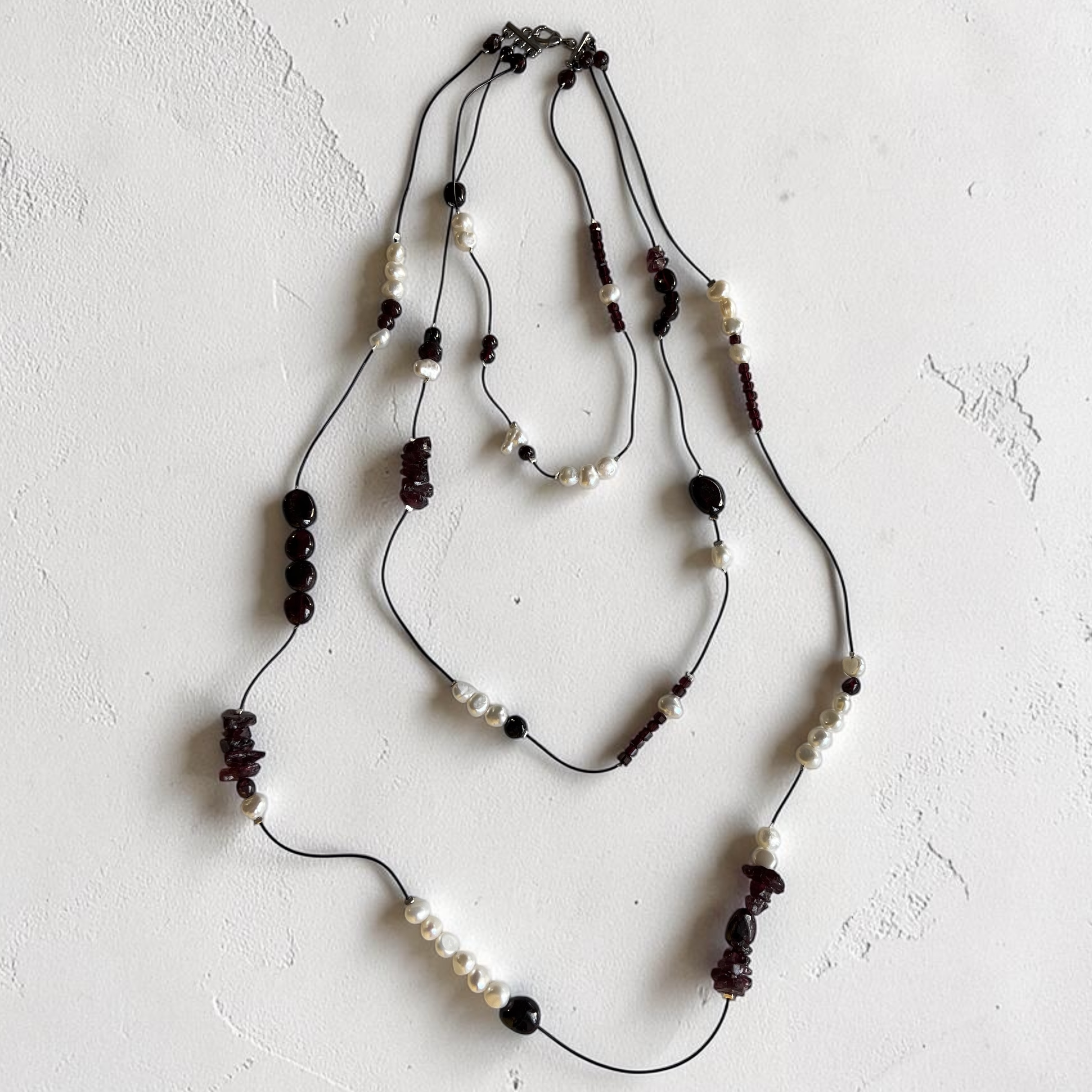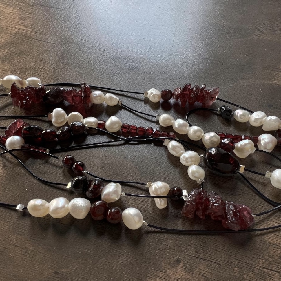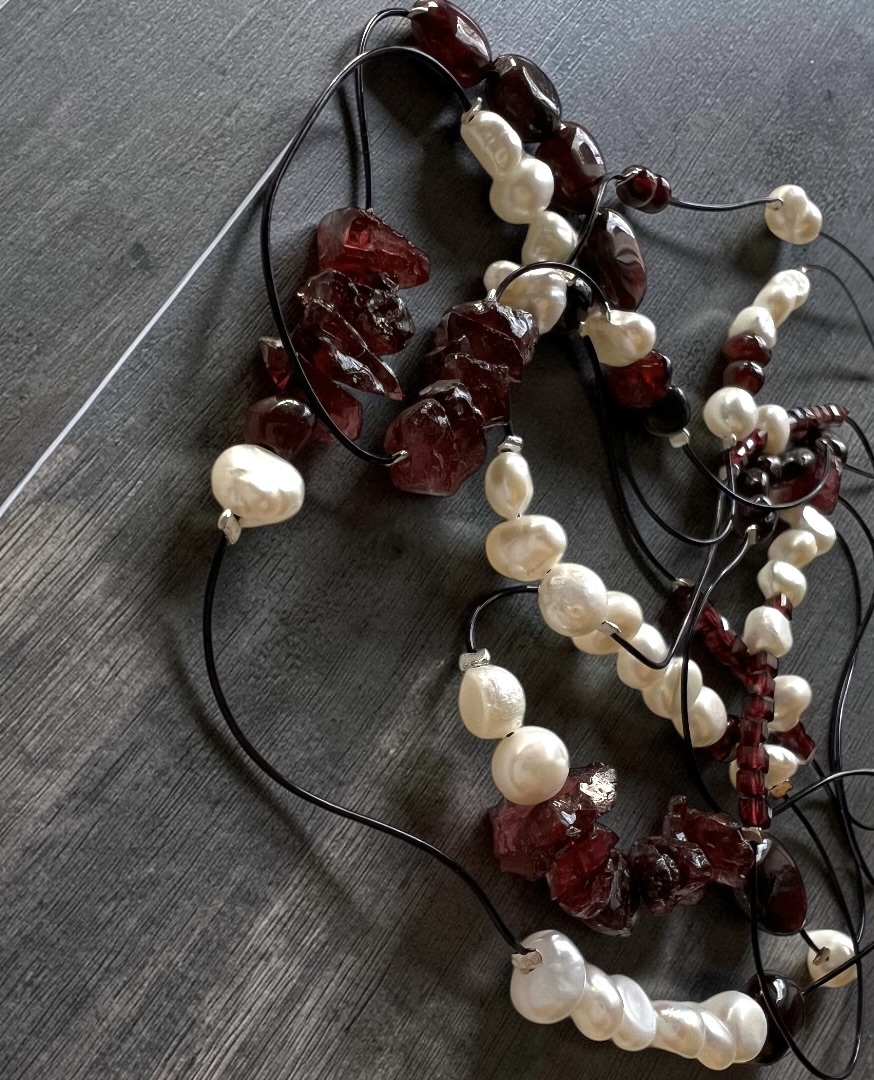 Очень красивый гранат трех видов: крошка, кубики в огранке и галтовка. Цвет граната особенно глубокий, насыщенный. И натуральный барочный жемчуг.