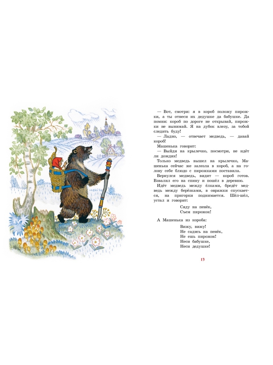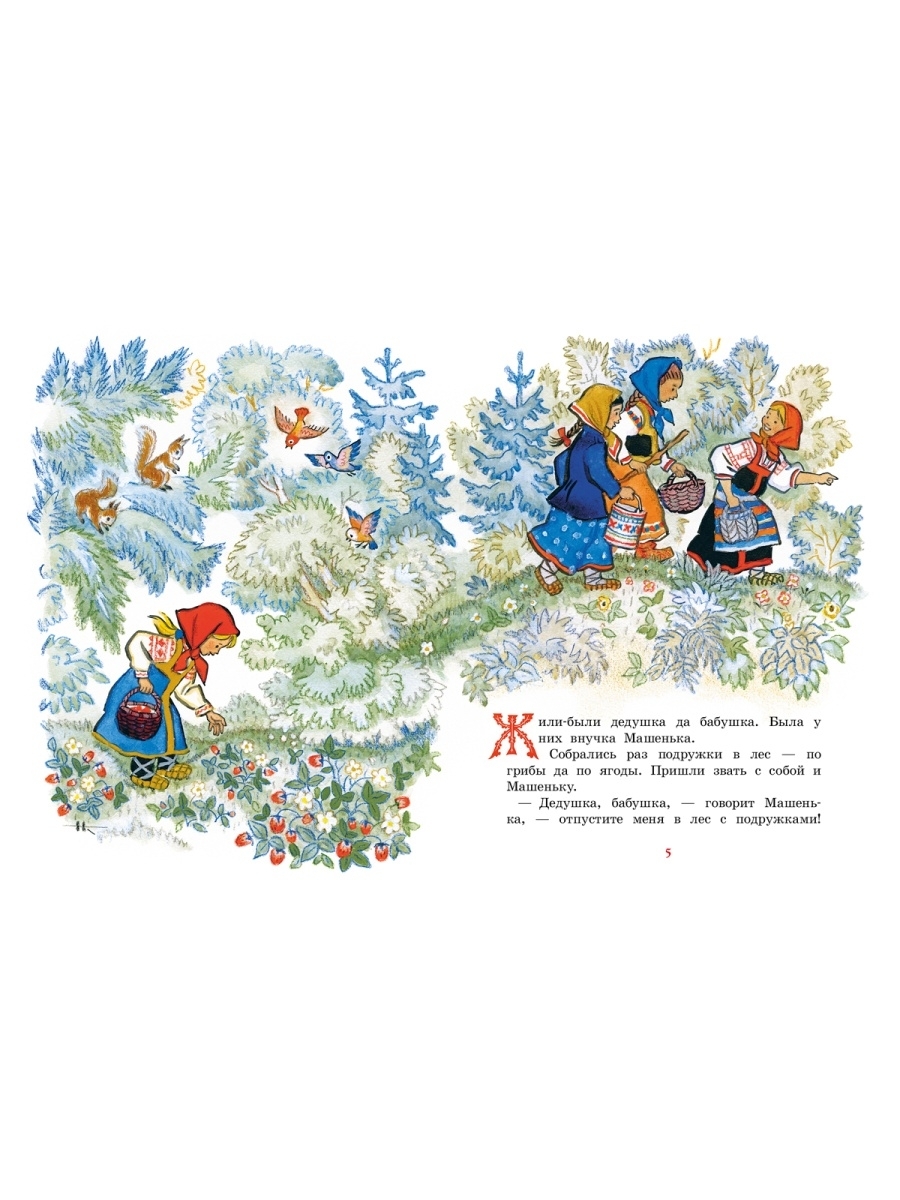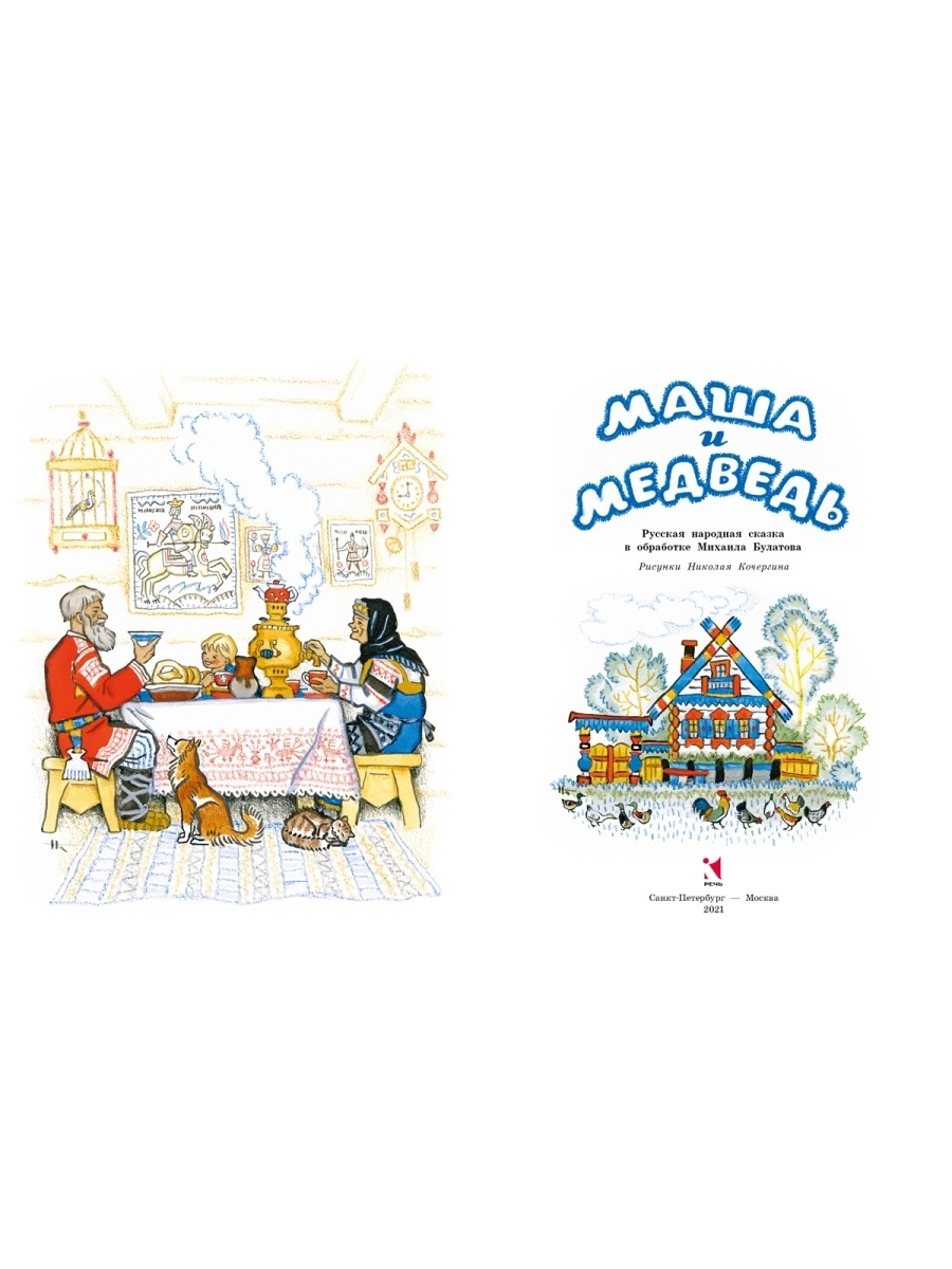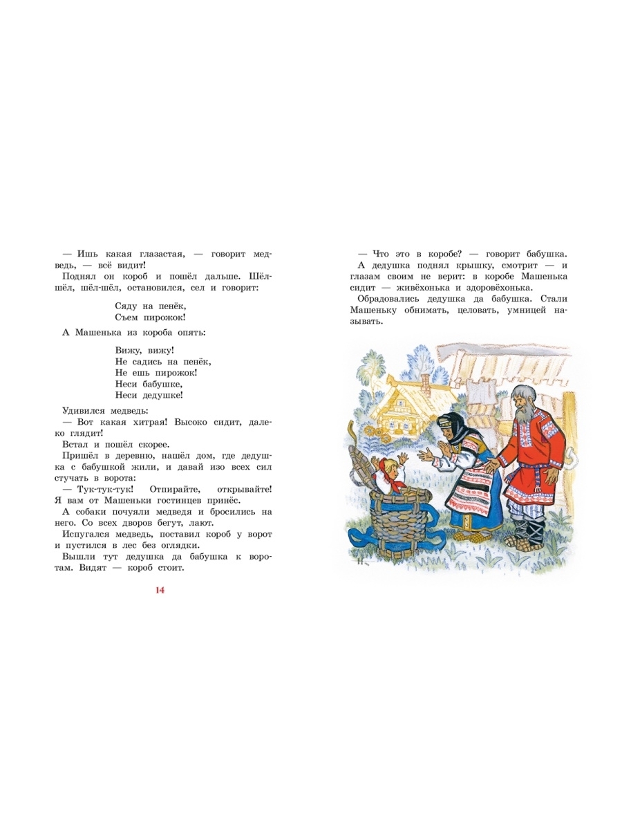 Заблудилась Машенька в лесу да попала к медведю. А тот обрадовался: будет в доме хозяйка, станет печь топить, кашу варить да его, косолапого, кормить. Не пускает медведь девочку домой, как ни проси. Но умница-Машенька скоро смекнула, как ей медведя перехитрить и к бабушке с дедушкой вернуться! Эта русская народная сказка в классическом пересказе Михаила Булатова увлечёт малышей своим занимательным сюжетом, а волшебные рисунки Николая Кочергина, художника-сказочника, сделают книгу по-настоящему любимой.