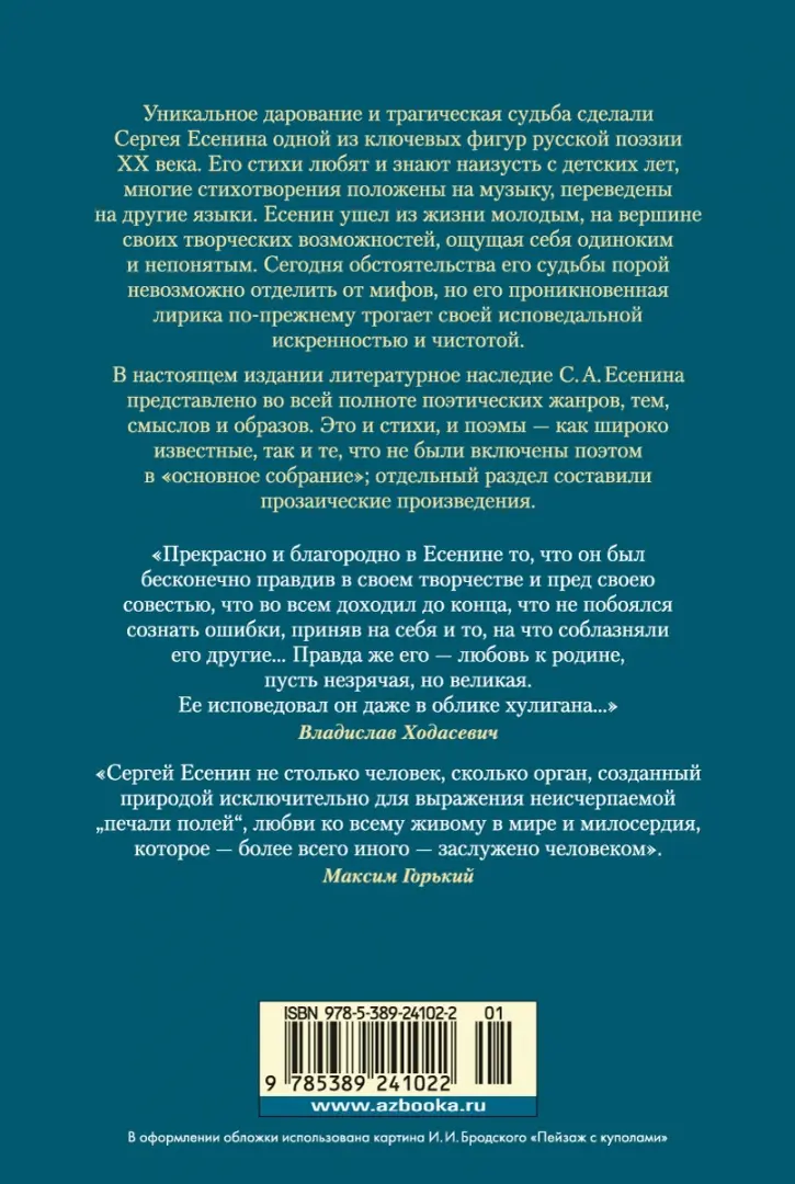В настоящем издании литературное наследие С. А. Есенина представлено во всей полноте поэтических жанров, тем, смыслов и образов. Это и стихи, и поэмы - как широко известные, так и те, что не были включены поэтом в "основное собрание"; отдельный раздел составили прозаические произведения.