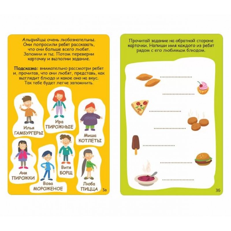 В набор входит 50 двусторонних многоразовых карточек с играми на развитие памяти и внимания разных уровней сложности и видов. Этот набор – настоящий тренажер! С помощью приемов, которые вы изучите, выполняя задания, можно не только узнавать и запоминать много нового, но и выучить иностранные языки, новые слова, цифры и многое другое.