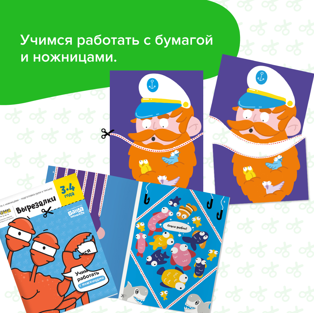 Тетрадь «Вырезалки, 3–4 года». Малыши учатся делать простые прямые разрезы и плавные изгибы. Задания с сюжетом увлекают детей! Гораздо интереснее спасать героев от пожара, собирать собственный бутерброд или управлять газонокосилкой, чем просто резать ножницами по заданной линии.