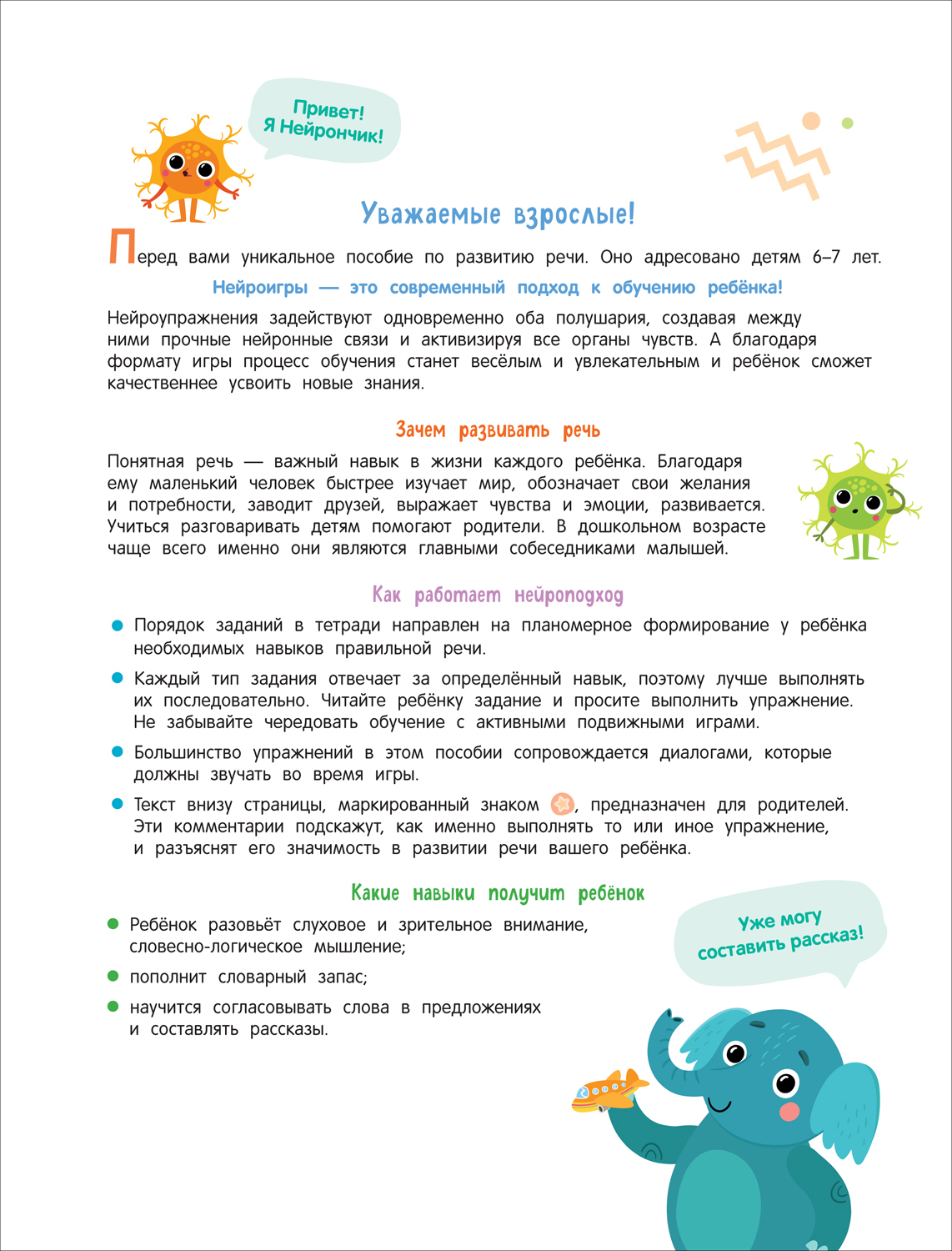 В этом пособии собраны нейроупражнения для детей 6–7 лет. С их помощью ребёнок в легкой игровой форме систематизирует знания об окружающем мире. А современная эффективная нейрометодика поможет ему быстро научиться составлять рассказы. Текст внизу страницы, маркированный знаком «звездочка», читает родитель.
