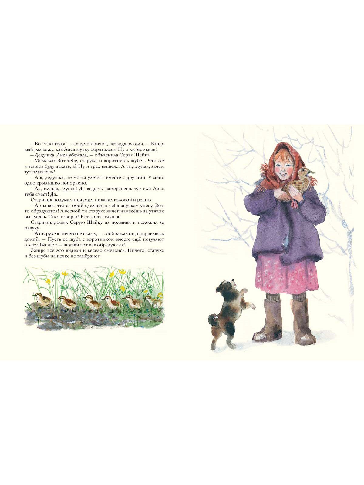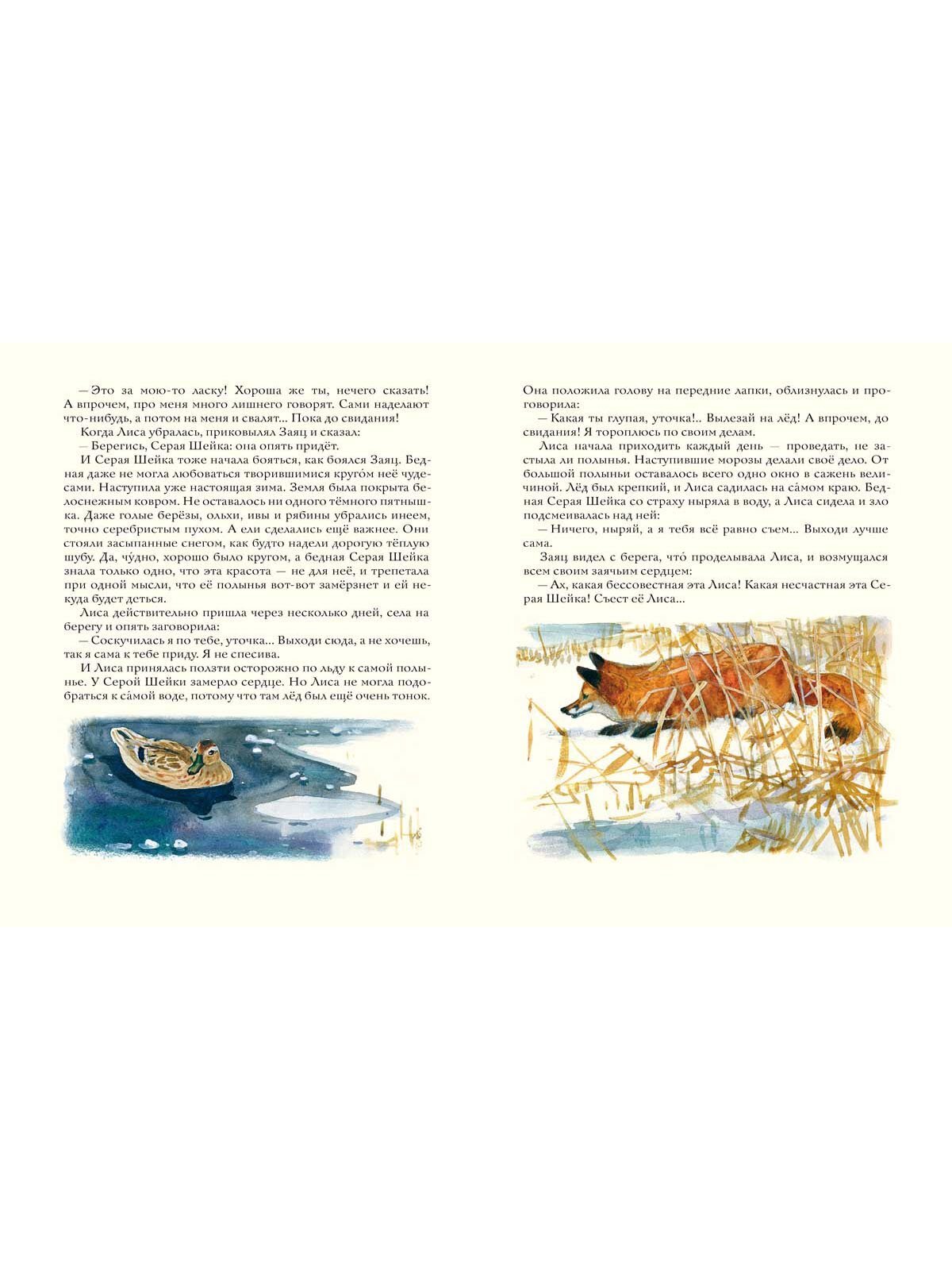 Серой Шейке предстоит провести холодную зиму совсем одной. Все её сородичи улетели в тёплые края. Но она не отчаивается и даже находит друга - Зайца. Всё бы ничего, но только к реке начала приходить Лиса… Сможет ли уточка со сломанным крылышком спастись от коварной Лисы? Любимую многими сказку проиллюстрировал художник, тонко чувствующий и понимающий природу, - Георгий Никольский.