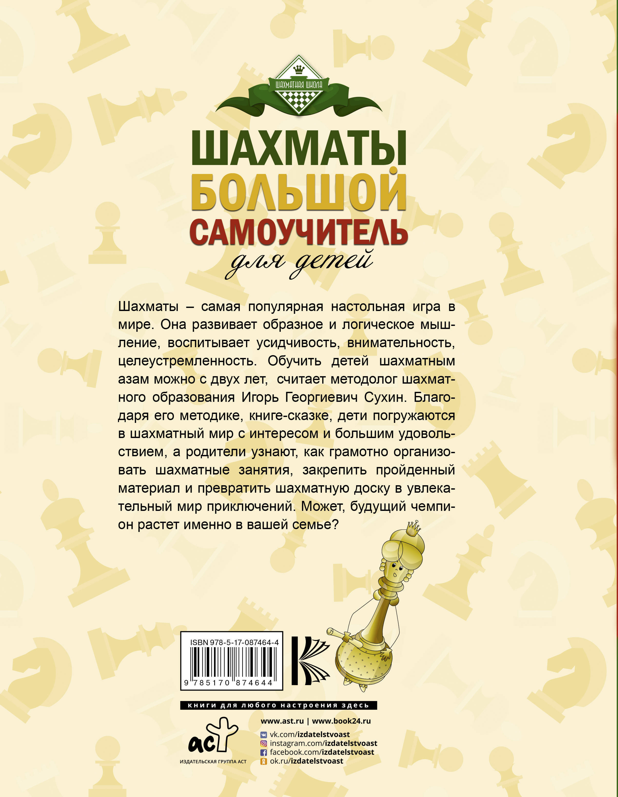 Шахматы – самая популярная настольная игра в мире. Она развивает образное и логическое мышление, воспитывает усидчивость, внимательность, целеустремленность. Обучить детей шахматным азам можно с двух лет, считает методолог шахматного образования Игорь Георгиевич Сухин. Благодаря его методике, книге-сказке, дети погружаются в шахматный мир с интересом и большим удовольствием, а родители узнают, как грамотно организовать шахматные занятия, закрепить пройденный материал и превратить шахматную доску в увлекательный мир приключений. Может, будущий чемпион растет именно в вашей семье?