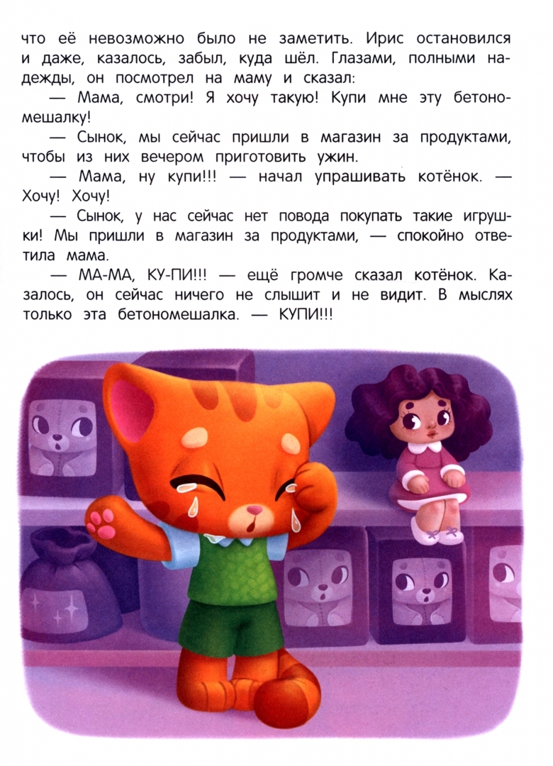 Психолог Мария Грошкова придумала истории о котёнке Ирисе: он хочет новую игрушку в магазине и не хочет ложиться спать, отказывается делиться и не желает собирать свои разбросанные вещи. Ирис протестует, требует, огорчается, но при поддержке родителей осваивает новые модели поведения.