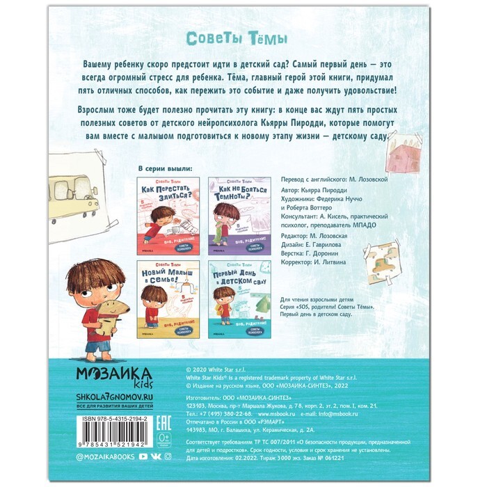 Взрослым тоже будет полезно прочитать эту книгу: в конце предлагается пять простых, но полезных советов от детского нейропсихолога Кьярры Пиродди, которые помогут вам вместе с малышом подготовиться к новому этапу жизни — детскому саду.