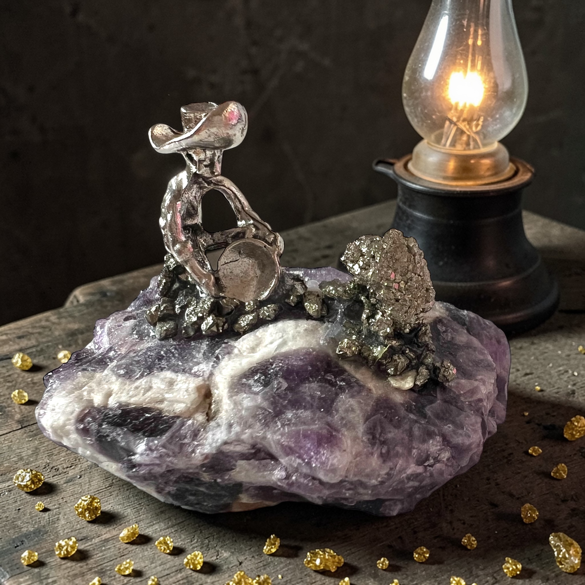 - Материалы: Аметист, пирит, металлическая (латунь) фигурка старателя.
