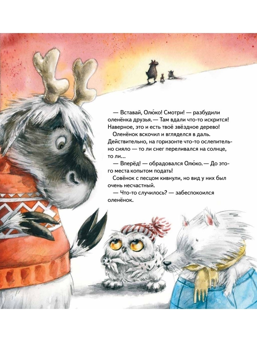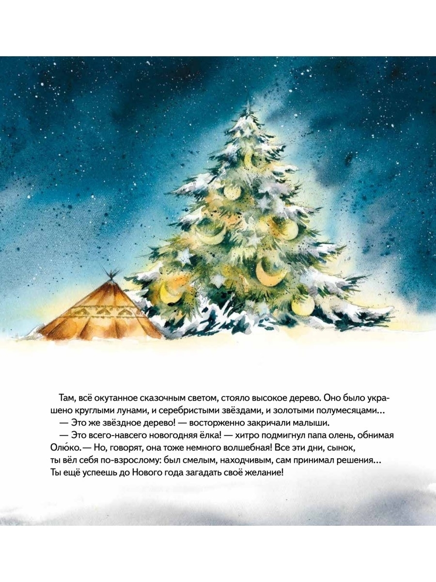 Оленёнок Олюко мечтает поскорее стать большим, чтобы носить такие же красивые ветвистые рога, как взрослые олени. Папа говорит, рога обязательно вырастут, как только Олюко научится быть смелым и решительным. Но ждать так тяжело! Проще загадать желание под волшебным звёздным деревом. И малыш отправляется вместе с друзьями на его поиски. Впереди оленёнка ждут отколовшаяся льдина, ночь в холодной и опасной тундре, спасение друзей и важное решение, от которого зависит - встретят ли они Новый год со своими семьями. Исполнится ли заветное желание Олюко? Об этом вы узнаете из доброй и волшебной истории. В книге вы найдёте не только новогоднюю сказку, но и полезную информацию об удивительном животном - северном олене.